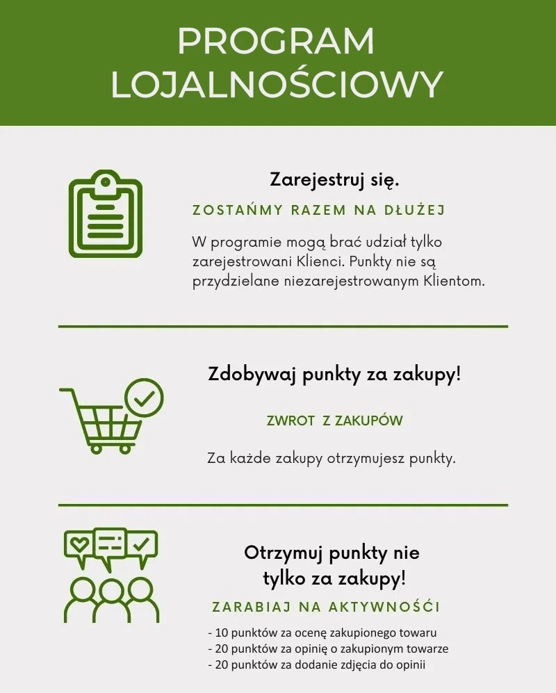Uczestnik naszego programu lojalnościowego posiada konto punktowe, na którym gromadzone są punkty otrzymywane za złożone i zrealizowane zamówienia w naszym sklepie. Punkty są naliczane po opłaceniu zamówienia, w przypadku zamówienia z formą płatności "za pobraniem" punkty zostaną naliczone po odnotowaniu wpłaty od firmy kurierskiej.
