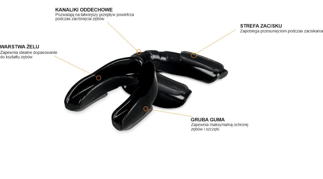 Ochraniacz na zęby z warstwą żelu, który podczas formowania dopasowuje się do kształtu uzębienia chroniąc je przed urazami podczas uderzeń. Ochraniacz przeznaczony jest na górną szczękę, po jego dopasowaniu trzyma się górnej szczęki, dzięki czemu trenujący może swobodnie oddychać.