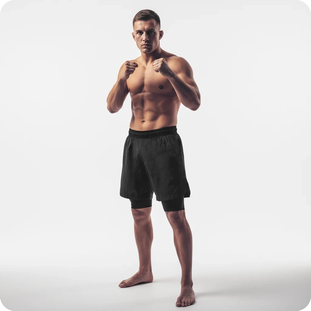 Spodenki MMA z wbudowanymi legginsami powstały z myślą o zawodnikach, którzy oczekują maksymalnej swobody i funkcjonalności. Lekki materiał zewnętrzny współpracuje z elastyczną warstwą kompresyjną, tworząc zestaw 2w1, który nie ogranicza ruchu nawet podczas najbardziej wymagających treningów.