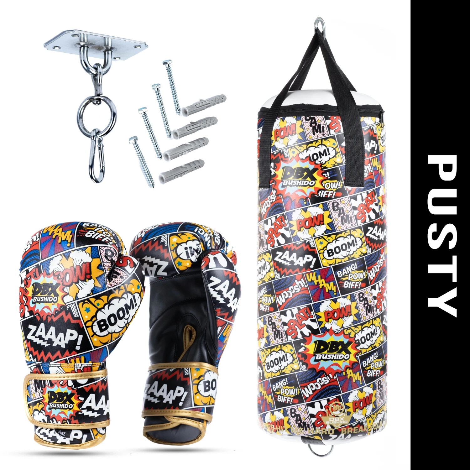 Zestaw bokserski DBX Cartoon Red to idealny wybór dla najmłodszych miłośników sportów walki. W komplecie znajduje się pusty worek treningowy, rękawice bokserskie 6 oz oraz mocowanie sufitowe.